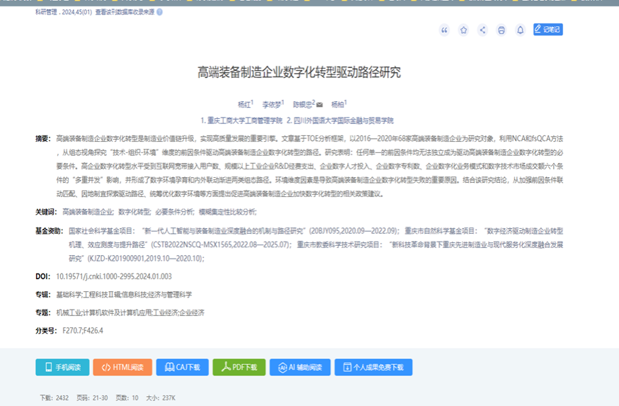 杨红,李依梦,陈银忠,等.高端装备制造企业数字化转型驱动路径研究[J].科研管理, 2024, 45(01):21-30.