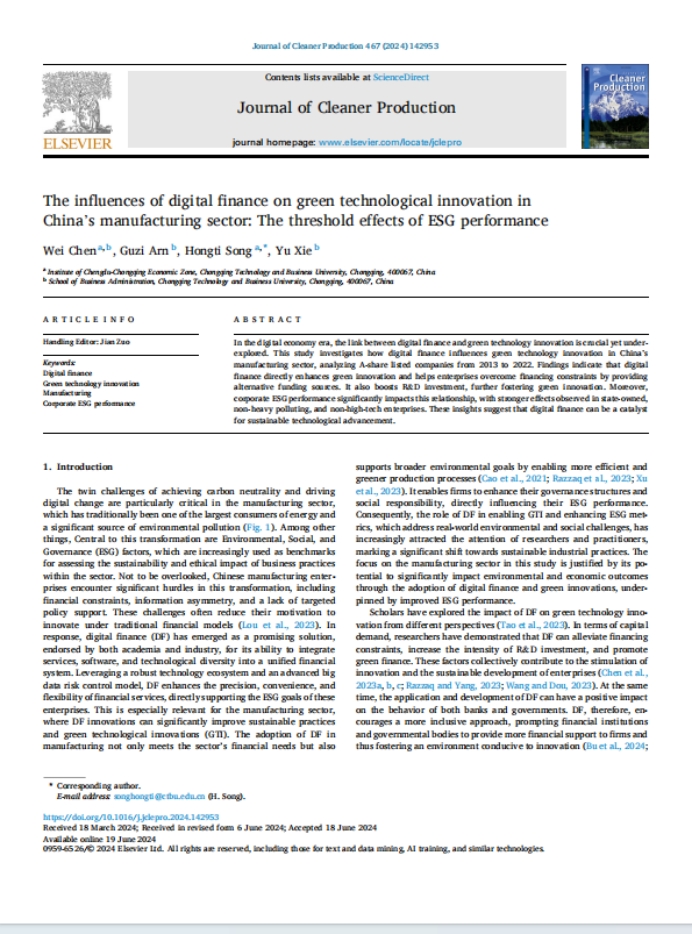 Chen W, Arn G Z, Song H T, Xie Y. The influences of digital finance on green technological innovation in China's manufacturing sector: the threshold effects of ESG performance[J]. Journal of Cleaner Production(中科院SCI一区Top期刊), 2024, 467: 142953.