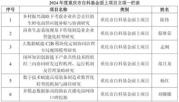 近期,重庆市自然科学基金面上项目申报结果出炉,我院在立项数量上取得了历史性突破。其中,陈伟教授、蔡继荣教授、孟炯教授、郑月龙教授、杨红教授、刘娜娜博士等6位老师喜获重庆市自然科学基金面上项目资助。