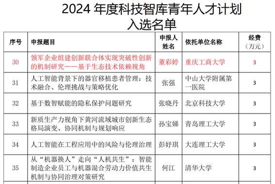 近期,中国科协战略发展部、中国科协创新战略研究院发布了《关于申报2024年度“科技智库青年人才计划”的通知》,根据中国科协项目管理有关规定,经组织专家形式审查和综合评审,共评选出180项。其中,我院董彩婷博士提交的《领军企业组建创新联合体实现突破性创新的机制研究——基于生态技术依赖视角》喜获“科技智库青年人才计划”立项资助。
