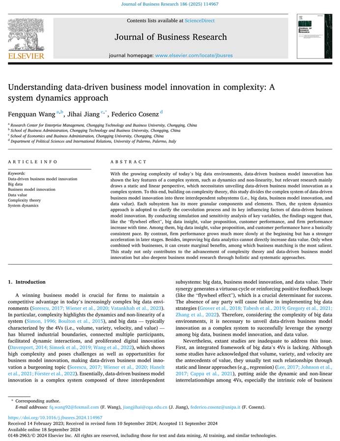 Fengquan Wang, Jihai Jiang, Federico Cosenz. Understanding data-driven business model innovation in complexity: A system dynamics approach. Journal of Business Research, 2025, 186:114967.(ABS 3星、中科院SSCI一区Top期刊)