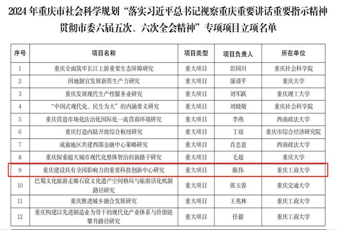 近期,2024年重庆市社会科学规划“落实习近平总书记视察重庆重要讲话重要指示精神贯彻市委六届五次、六次全会精神”专项项目评审结果出炉,我院教师陈伟教授获批“重大项目”1项,这也是陈伟教授主持的“2022年重庆市社会科学规划成渝地区双城经济圈建设重大项目”顺利结题后获批的又一项省部级重大项目。