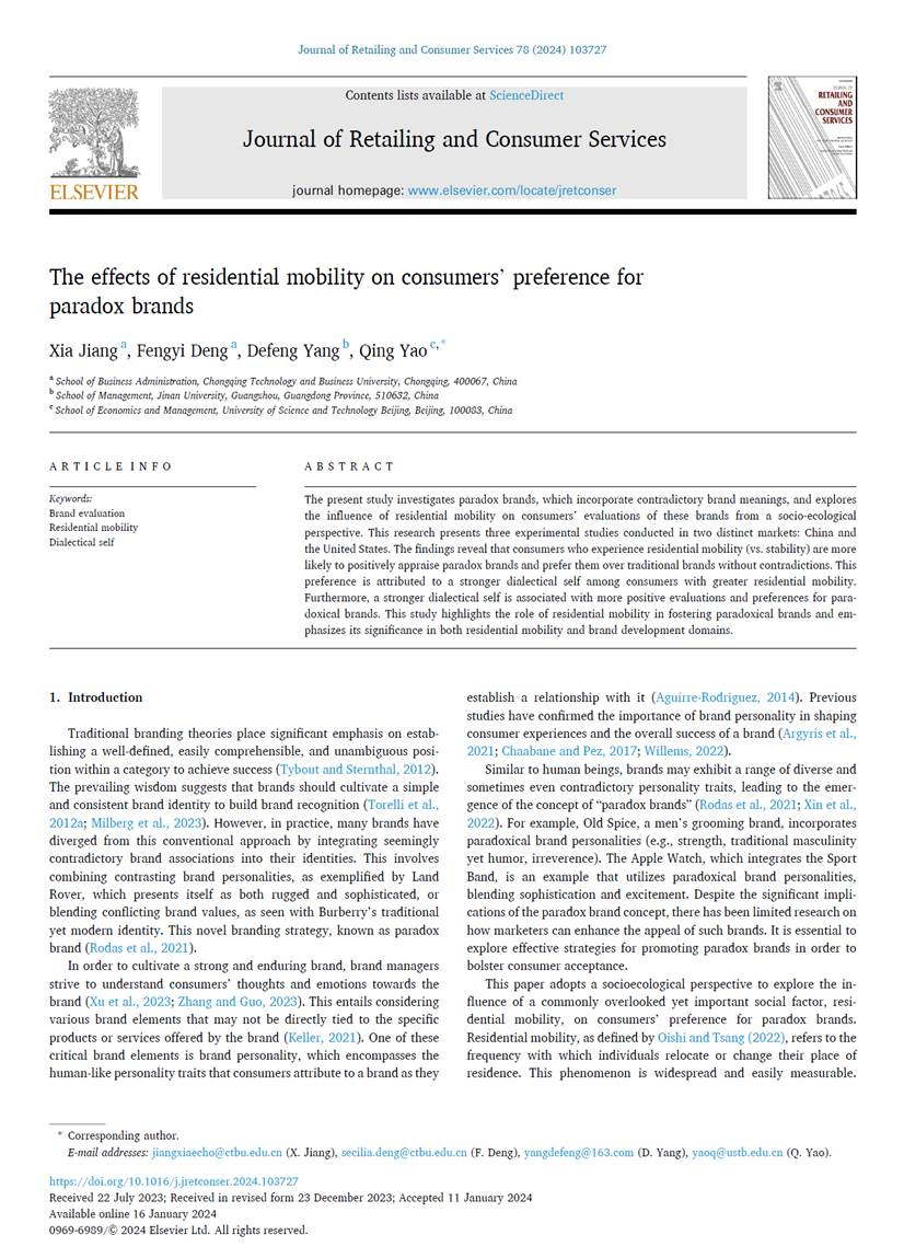 Jiang X, Deng F, Yang D, et al. The effects of residential mobility on consumers’ preference for paradox brands[J]. Journal of Retailing and Consumer Services, 2024, 78: 103727.(中科院SSCI一区Top期刊)