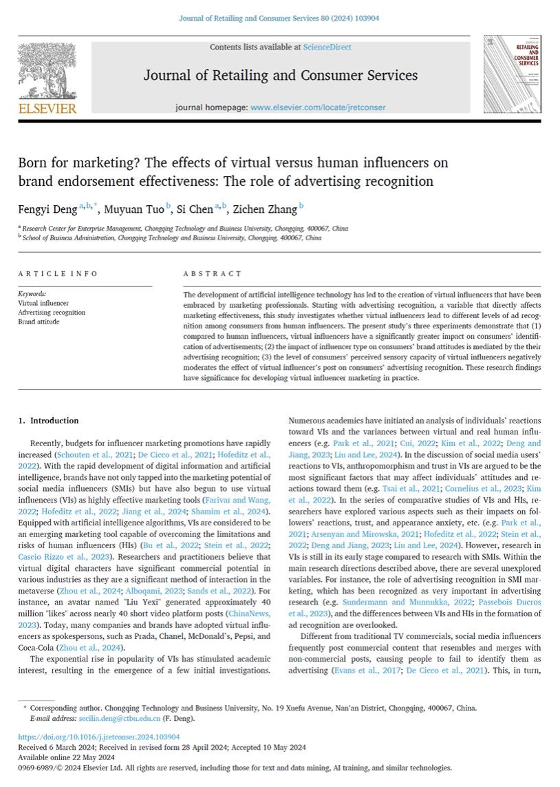 Deng F, Tuo M, Chen S, et al. Born for marketing? The effects of virtual versus human influencers on brand endorsement effectiveness: The role of advertising recognition[J]. Journal of Retailing and Consumer Services, 2024, 80: 103904.(中科院SSCI一区Top期刊)