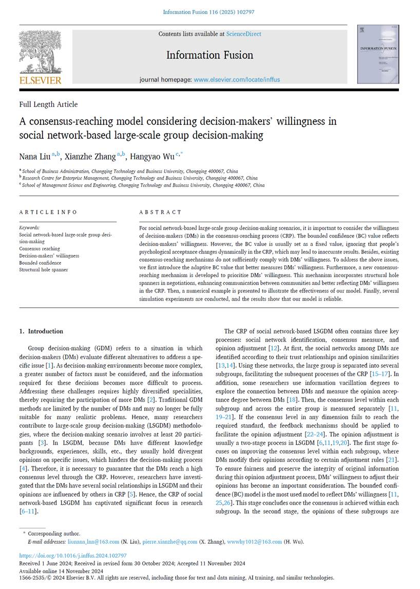 Liu N, Zhang X, Wu H. A consensus-reaching model considering decision-makers’ willingness in social network-based large-scale group decision-making[J]. Information Fusion, 2025, 116: 102797.(中科院SCI一区Top期刊)