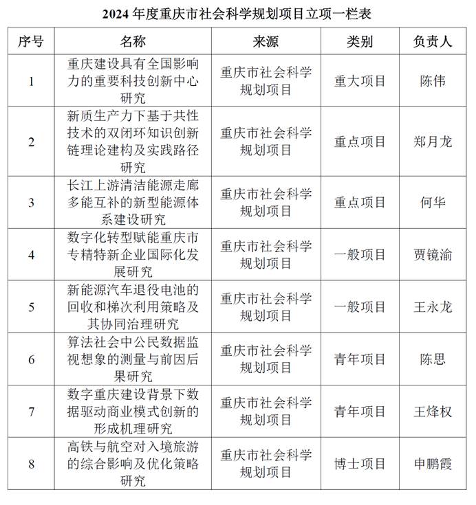 近期,重庆市社会科学规划办公室相继公布了2024年度重庆市社会科学规划各类项目的立项名单,我院陈伟教授、郑月龙教授、何华副教授、贾镜渝副教授、王永龙副教授、陈思副教授、王烽权博士、申鹏霞博士等8位老师喜获重庆市社会科学规划项目立项资助,在立项数量上再创佳绩。