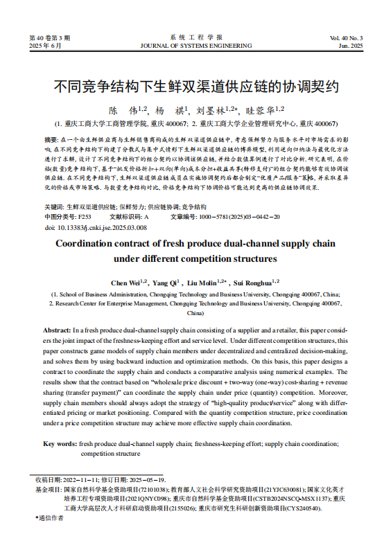 陈伟, 杨 祺, 刘墨林, 眭蓉华. 不同竞争结构下生鲜双渠道供应链的协调契约[J]. 系统工程学报(CSCD核心期刊、国家自然基金委A类重要期刊、FMS中文T1期刊). 2025, 40(3): 442-461.
