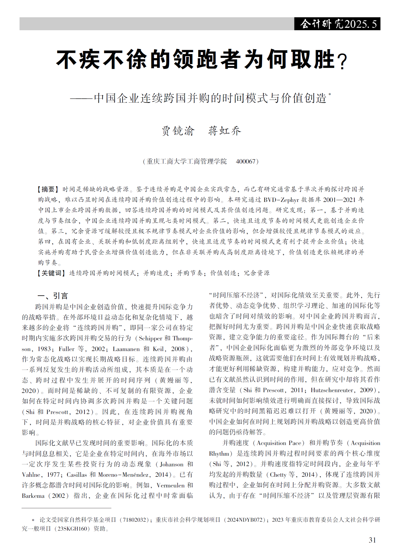 贾镜渝,蒋虹乔.不疾不徐的领跑者为何取胜?——中国企业连续跨国并购的时间模式与价值创造[J].会计研究(CSSCI核心期刊、国家自然基金委A类重要期刊、FMS中文T1期刊). 2025 (05):31-46.