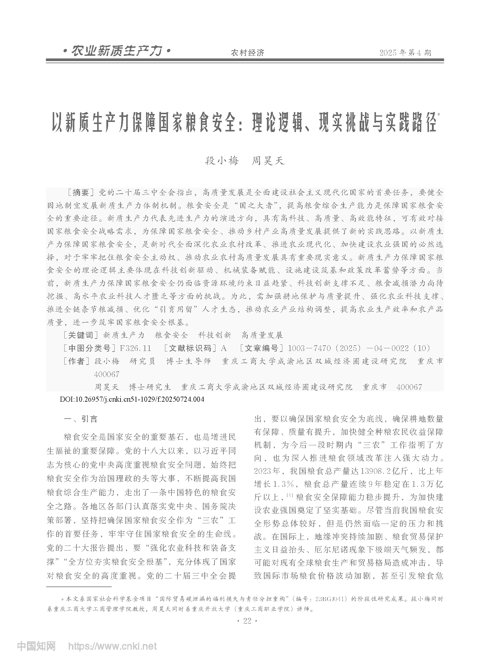 段小梅,周昊天.以新质生产力保障国家粮食安全:理论逻辑、现实挑战与实践路径[J].农村经济,2025,(04):22-31.