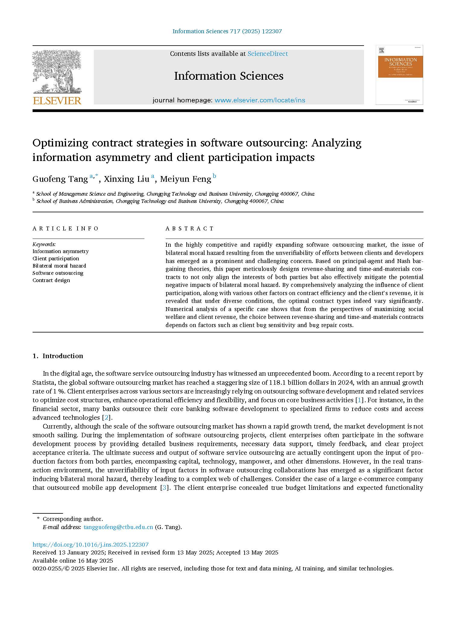 Tang G F, Liu X X, Feng M Y. Optimizing contract strategies in software outsourcing: Analyzing information asymmetry and client participation impacts [J]. Information Sciences (重庆工商大学T2期刊). 2025, 717: 122307.https://doi.org/10.1016/j.ins.2025.122307.