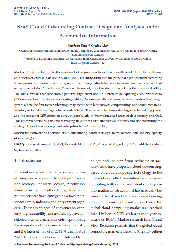 Tang G, Liu X. SaaS Cloud Outsourcing Contract Design and Analysis under Asymmetric Information[J].Journalof SystemsScienceand Systems Engineering, 2025: 1-21.