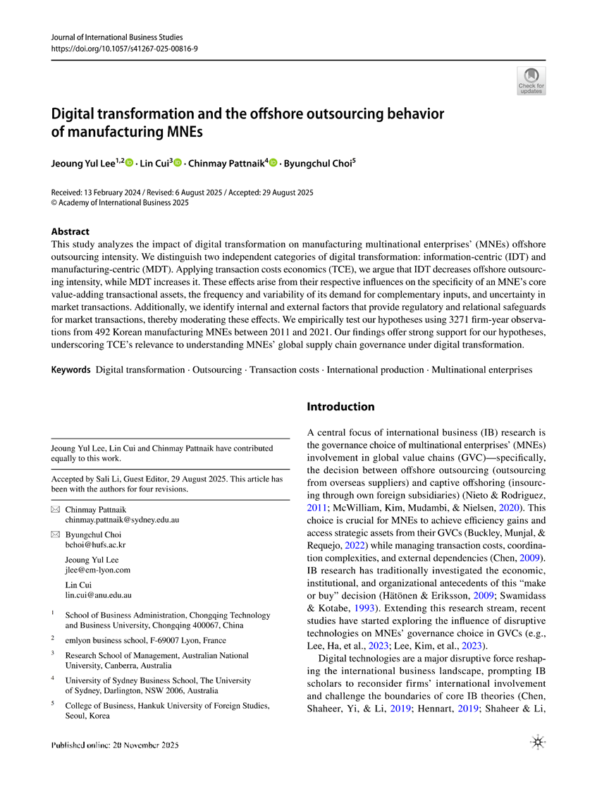 Jeoung Yul Lee, Lin Cui, Chinmay Pattnaik & Byungchul Choi. Digital transformation and the offshore outsourcing behavior of manufacturing MNEs [J]. Journal of International Business Studies, 2025. https://doi.org/10.1057/s41267-025-00816-9