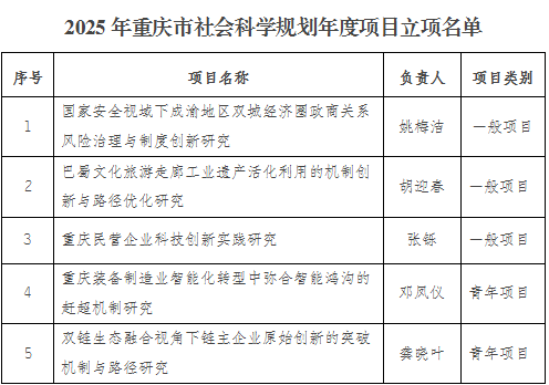 12月11日,重庆市社会科学规划办公室公布了《2025年度重庆市社会科学规划项目立项名单》,我院报送的5项课题获得重庆市社会科学规划年度项目立项资助,其中一般项目3项,青年项目2项。