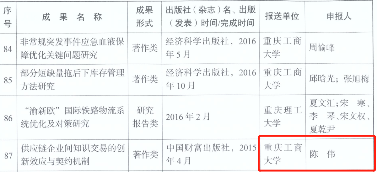 该专著“供应链企业间知识交易的创新效应与契约机制”于2015年4月由中国财富出版社出版,并入选为该出版社供应链管理专家专著丛书,是陈伟教授主持的2013年国家社会科学基金项目(批准号:13CGL013)“关系和信任导向下供应链企业间知识共享的创新效应与实现机制研究”和2013年重庆市教委科学技术研究项目(批准号:KJ131003)“合作创新视角下供应链企业间知识共享的治理机制及其实证研究”的阶段性研究成果,国家社会科学基金项目已于2017年2月结题,鉴定等级为良好,证书号为20170351,结题报告入选了《重庆社科成果提要汇编》。