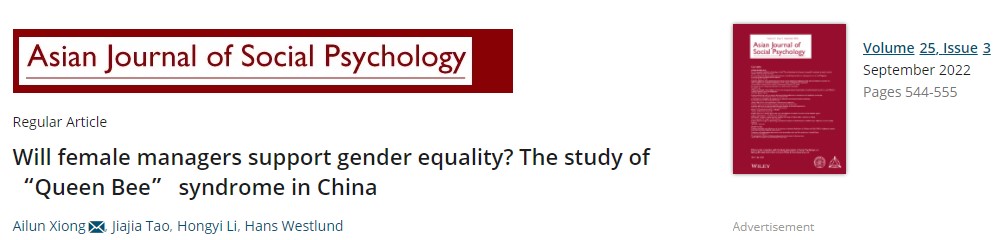 近日,我院熊艾伦副教授及其团队所撰写的论文——Will female managers support gender equality? The study of “Queen Bee” syndrome in China被Asian Journal of Social Psychology录用并发表。Asian Journal of Social Psychology是亚洲社会心理学会的旗舰期刊,于1998年创刊,目前属于JCR4区。收录出版社会心理学、一般心理学相关领域的学术论文。