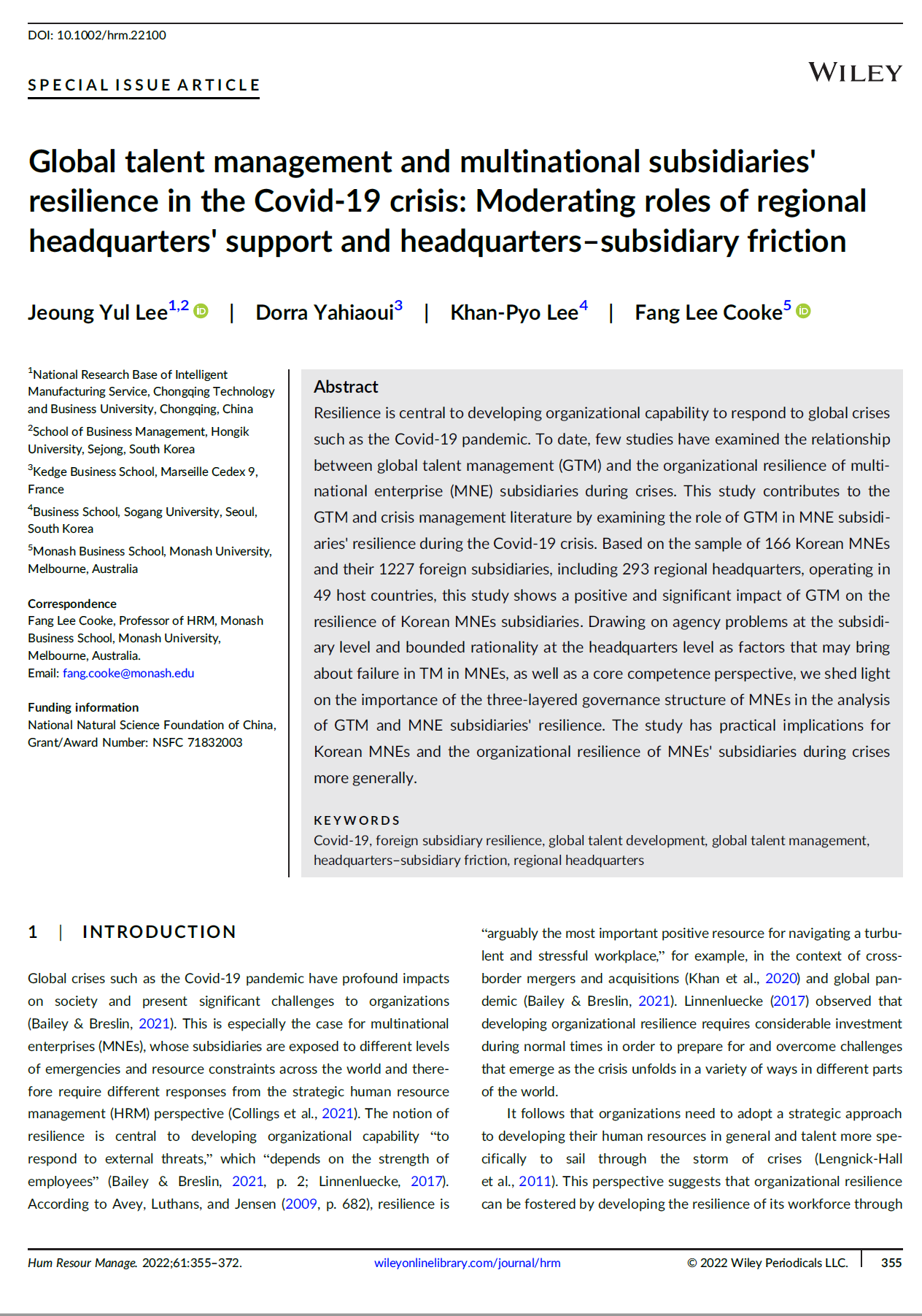 2022年2月14日,重庆工商大学44118太阳成tyc城集团Jeoung Yul Lee教授,以第一作者身份、重庆工商大学为第一单位,在国际顶级FT50期刊《Human Resource Management》发表题为《Global talent management and multinational subsidiaries’ resilience in the Covid-19 crisis: Moderating roles of regional headquarters’ support and headquarters subsidiary friction》的研究论文。