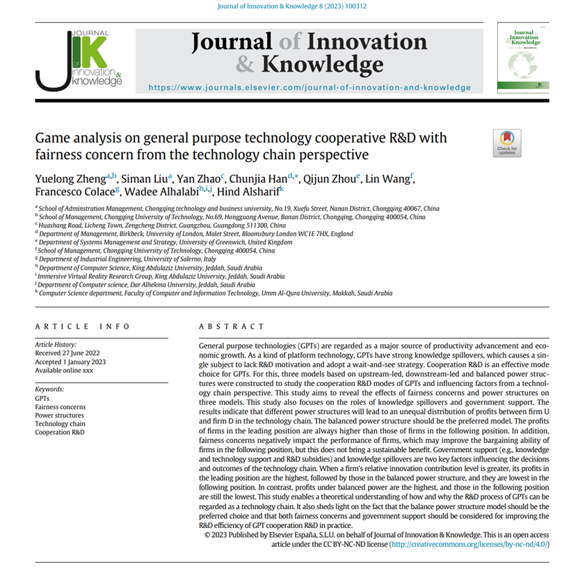 Yuelong Zheng, Siman Liu, Yan Zhao, Chunjia Han, Qijun Zhou, Lin Wang, Francesco Colace, Wadee Alhalabi, Hind Alsharif. Game analysis on general purpose technology cooperative R&D with fairness concern from the technology chain perspective [J]. Journal of Innovation & Knowledge, 2023. 100312.