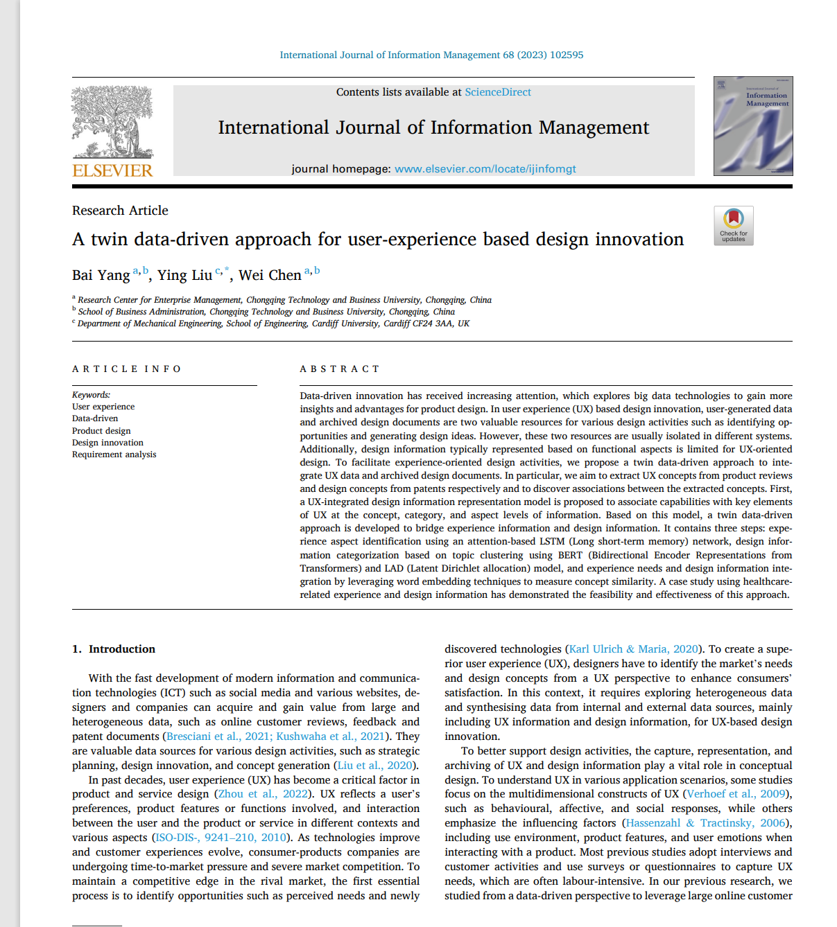 Bai Yang, Ying Liu, Wei Chen. A twin data-driven approach for user-experience based design innovation [J]. International Journal of Information Management, 2023, 102595.