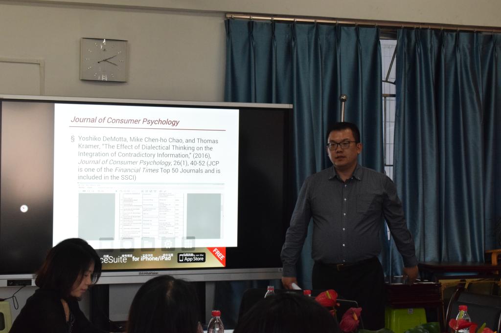 首先,黄院长对Mike Chao博士的到来表示热烈欢迎,以及对此次讲座的期待。赵教授正式开讲前表示,此次专题讲座的目的专为分享他发表在 Journal of Consumer Psychology, (2016,26(1), 40-52) 40-52 (JCP is one of the Financial Times Top 50 Journals and is included in the SSCI)的学术研究论文“The Effect of Dialectical Thinking on the Integration of Contradictory Information”。