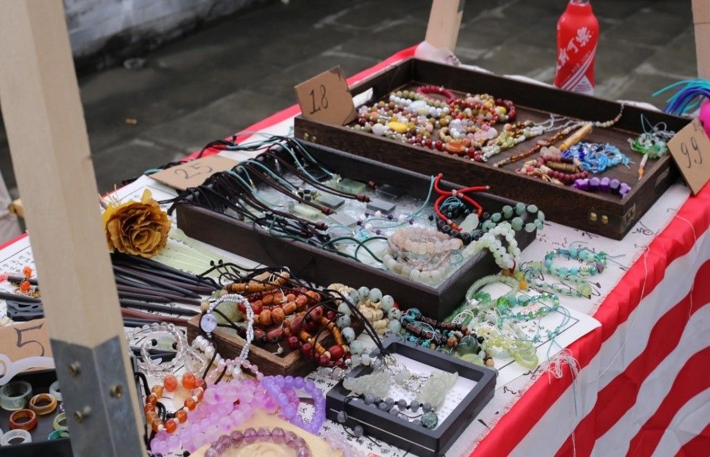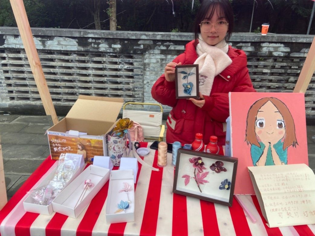 来自大三的文同学在现场演示了非遗缠花,其制作的胸针和装饰画样式精美,供不应求,文同学表示:“这是我第一次参加这样的活动,平时更多的时候是在自己的寝室进行一些创作,没想到大家这么喜欢我的作品,很感谢学校的提供的集市活动机会,也让我对非遗和手工艺行业有了更多的畅想。”