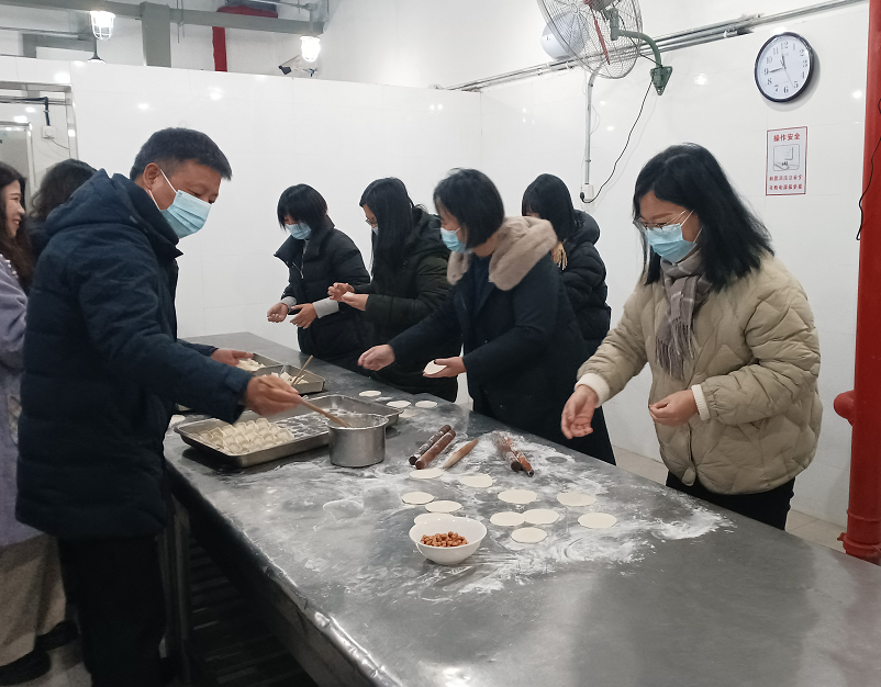 在冬至即将来临之际,为了让紧张备考的学子能够吃到一份热气腾腾的饺子,学院党政领导和辅导员老师们上午一早就来到兰苑食堂忙碌起来,大家分工有序,揉面、擀皮、调馅、用心为同学们包饺子,在食堂厨师的帮助下,一个个形状各异的饺子煮出来以后和粽子一起打包分发给在场的考研学子,每一个饺子和粽子,都蕴含着学院领导和老师们对考研学子“步步高中”的祝福。
