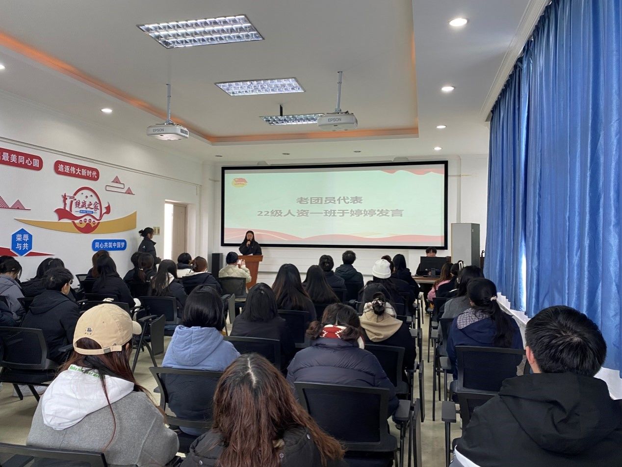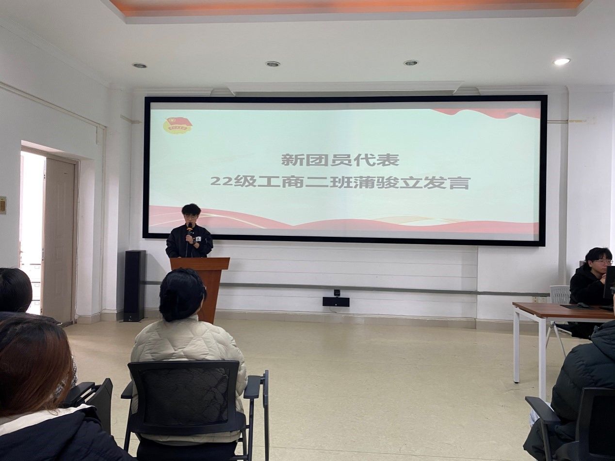 在庄严的国歌和嘹亮的歌声中新团员入团仪式正式拉开帷幕。首先,由主持人宣布学院新团员名单,并为新团员颁发团章、团员证以及团徽。在鲜艳的团旗下,全体新团员在领誓员的带领下宣誓,“我志愿加入中国共产主义青年团……”誓言代表的不只是新团员的决心,也表现了团员们心中对于自己团员身份的自豪感。紧接着,入团介绍人谭予涵代表宣读《团章》中有关团员的义务和权利的条款。随后,新团员代表22级工商二班蒲峻立同学上台发言,深刻传达了新团员入团的坚定信念与决心。22级人资一班于婷婷作为老团员代表发言,向新入团的同学表达了最热烈的祝贺和最诚挚的期盼,表示作为一名共青团员,应该时刻牢记使命和责任,不断提高自身素质。