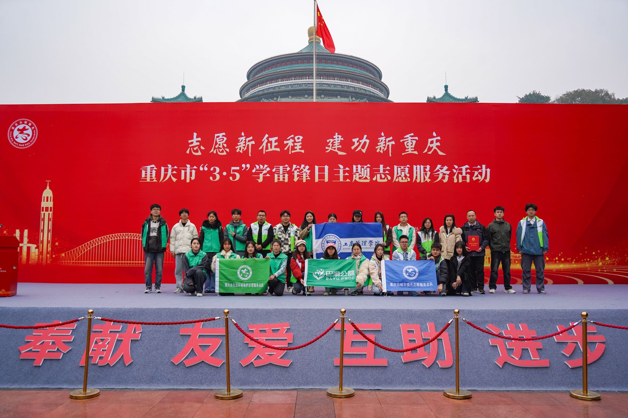 学院与巴渝公益共同组建志愿服务队结对,在重庆人民广场参与由市委社会工作部、市委宣传部等8个部门联合主办的重庆市“3·5”学雷锋日主题志愿服务活动,负责了双碳嘉年华、垃圾分类、无废城市三个生态环境类主题志愿服务项目展位服务工作。