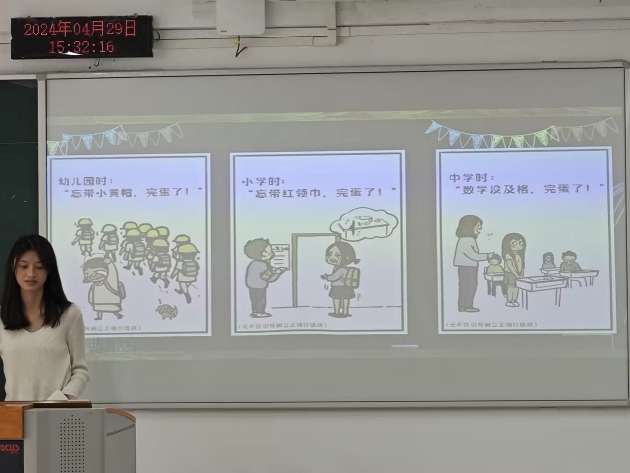 本次心理主题班会围绕“人生容错率比你想象的更大”主题开展,通过分享一系列富有启发性的心理漫画和情景模拟,启发学生认识到“挫折是成长的必修课,在这堂特殊的人生“必修课”中能够收获属于自己的成长智慧”,从而增强学生承受和适应挫折与失败的能力,更加从容迎接人生的每一次挑战。