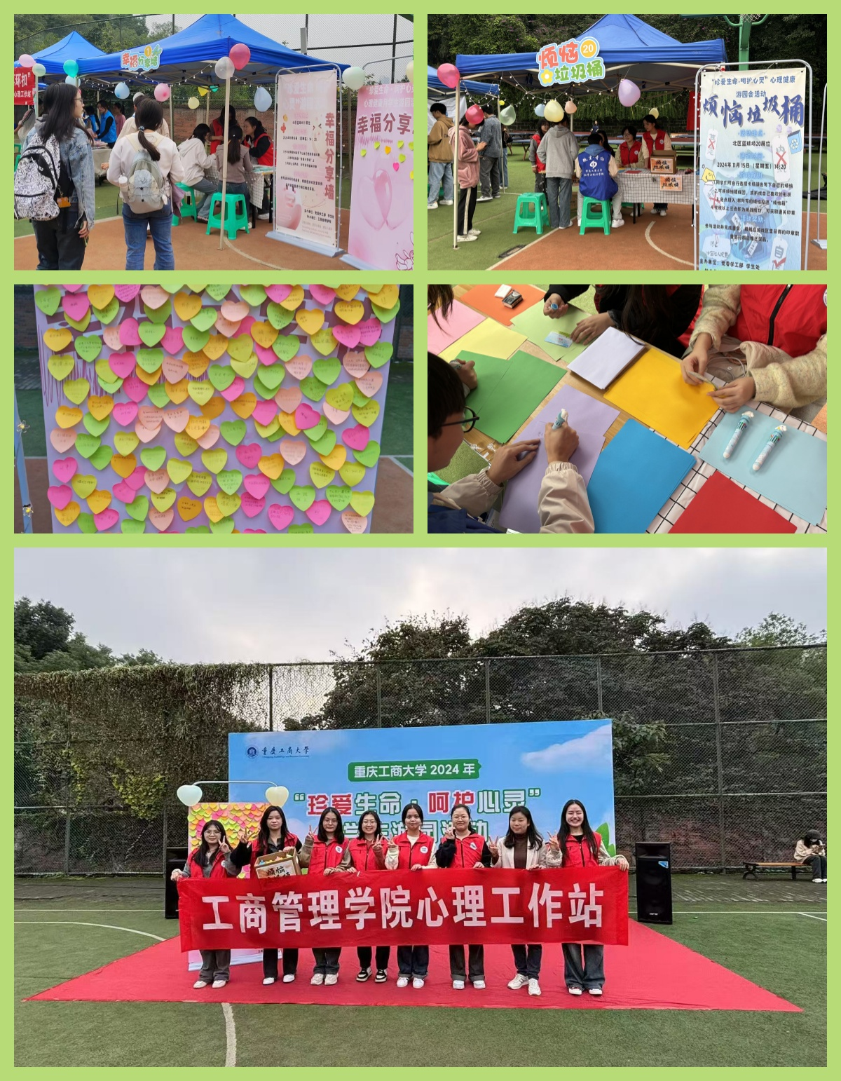 11月15日,44118太阳成tyc城集团以党委学工部学生处主办的重庆工商大学2024年“珍爱生命·呵护心灵”学生游园活动为平台,开展了“幸福分享墙”和“烦恼垃圾桶”两项特色活动,吸引了众多学生前来参与体验。