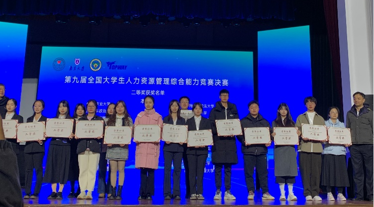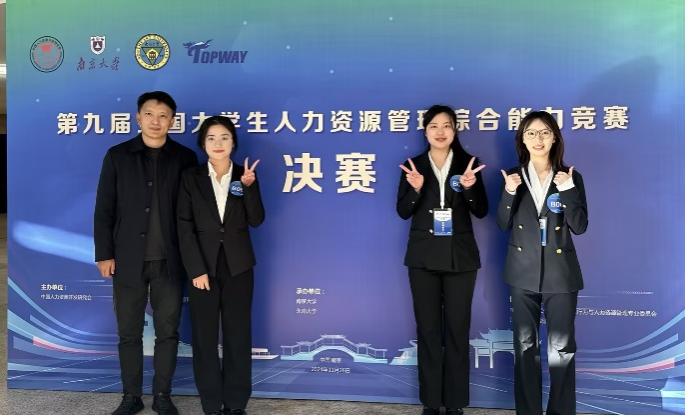 2024年11月26日,由中国人力资源开发研究会主办,南京大学、东南大学联合承办,上海踏瑞科技有限公司提供技术支持的第九届全国大学生人力资源管理综合能力竞赛决赛顺利落幕。本届赛事吸引了全国508所高校1501支队伍参赛,经过校赛、市赛、区域赛的层层选拔,最终73支本科生队伍和12支研究生队伍进入决赛。决赛历时4天,包括线上系统对抗和线下案例分析两个环节。我院人力资源管理专业22级学生吴玉洁、于婷婷、胡蓝之三位同学在鄢清华老师、熊雪原老师的指导下,代表学校参赛并荣获全国二等奖。