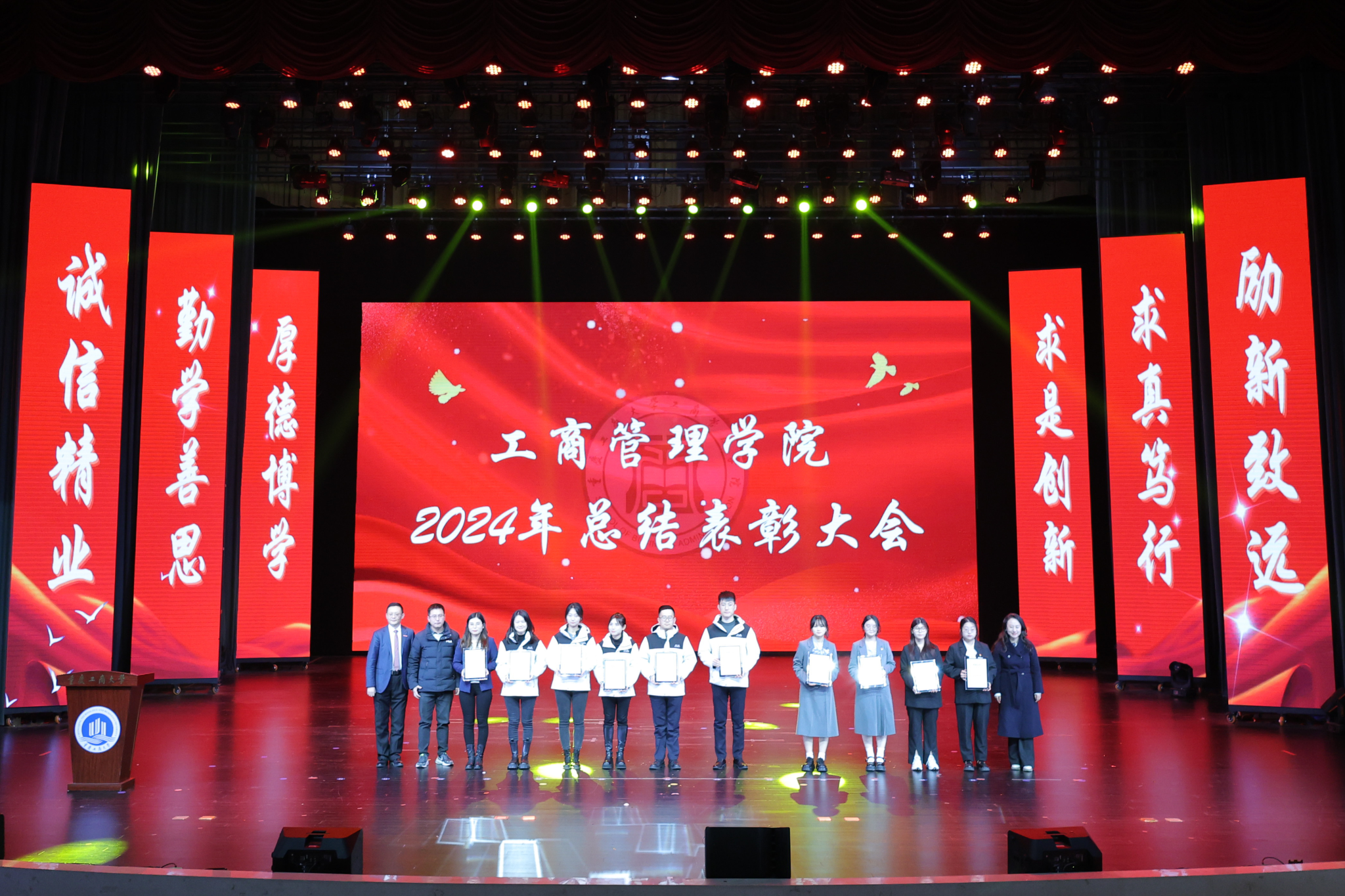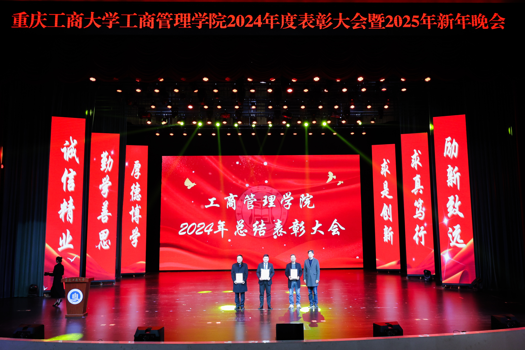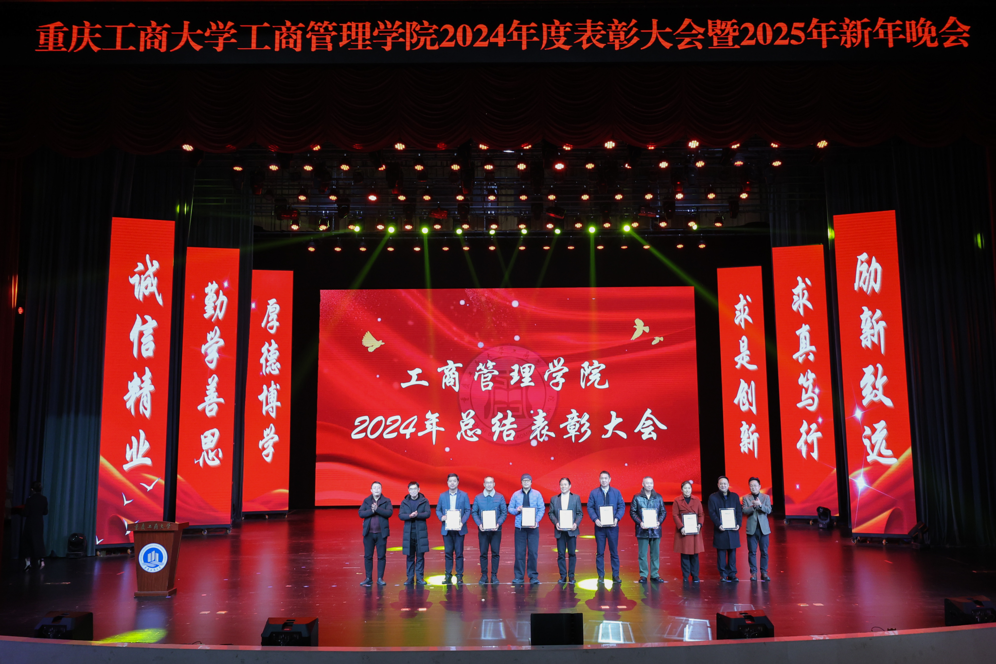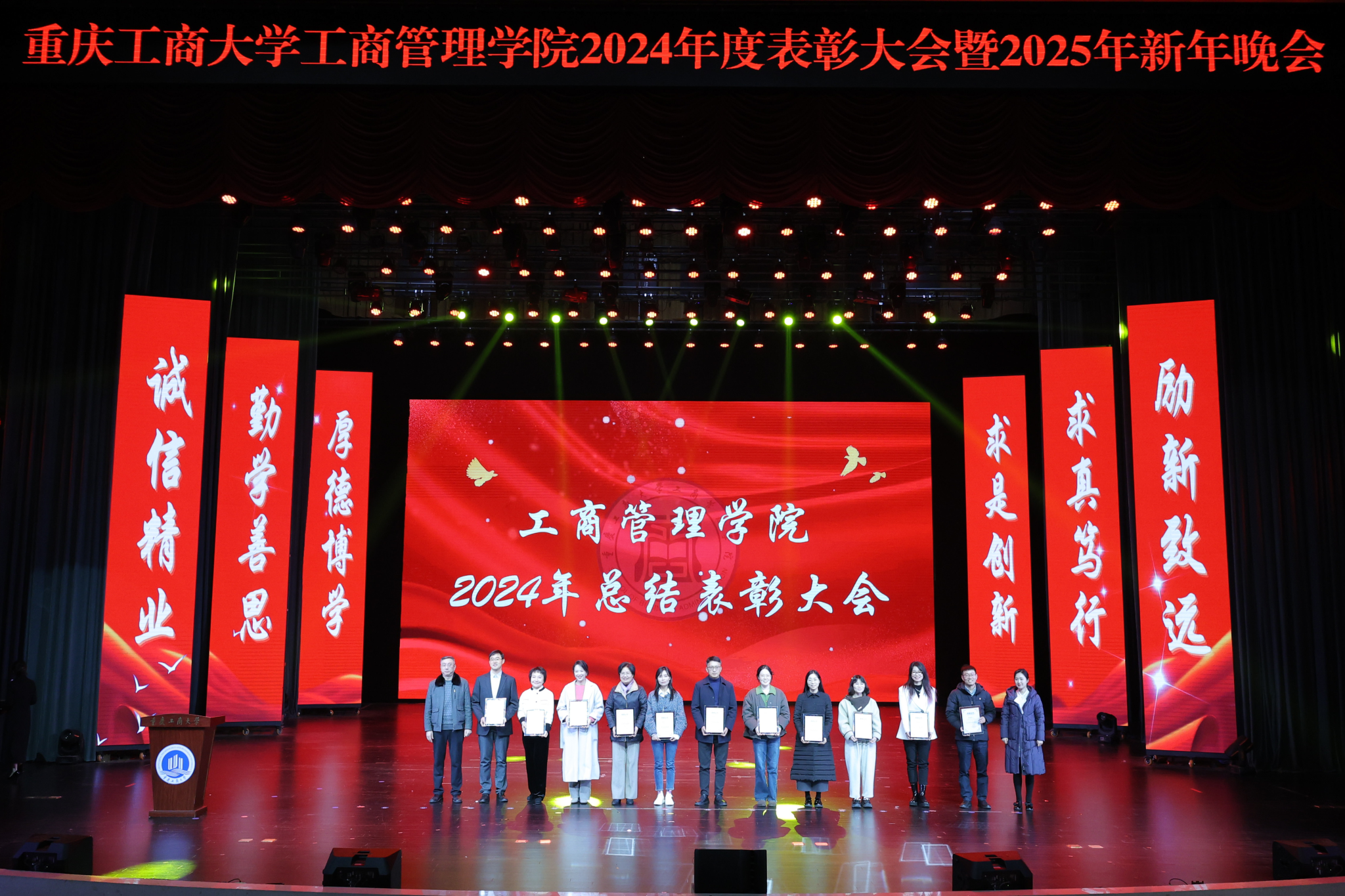 祥龙辞旧岁,金蛇舞新春。“奋楫扬帆共奋进,赓续前行向未来”重庆工商大学44118太阳成tyc城集团2024年度表彰大会暨2025年新年晚会于2024年12月19日晚上19:00,在学校大剧场隆重举行。重庆工商大学组织部、学工部、发规处、校友办、教务处、科研处、研工部、招就处、校团委、校友会负责人应邀出席晚会,44118太阳成tyc城集团党政班子、导师代表、教师代表、学生代表600余人共同参加晚会。