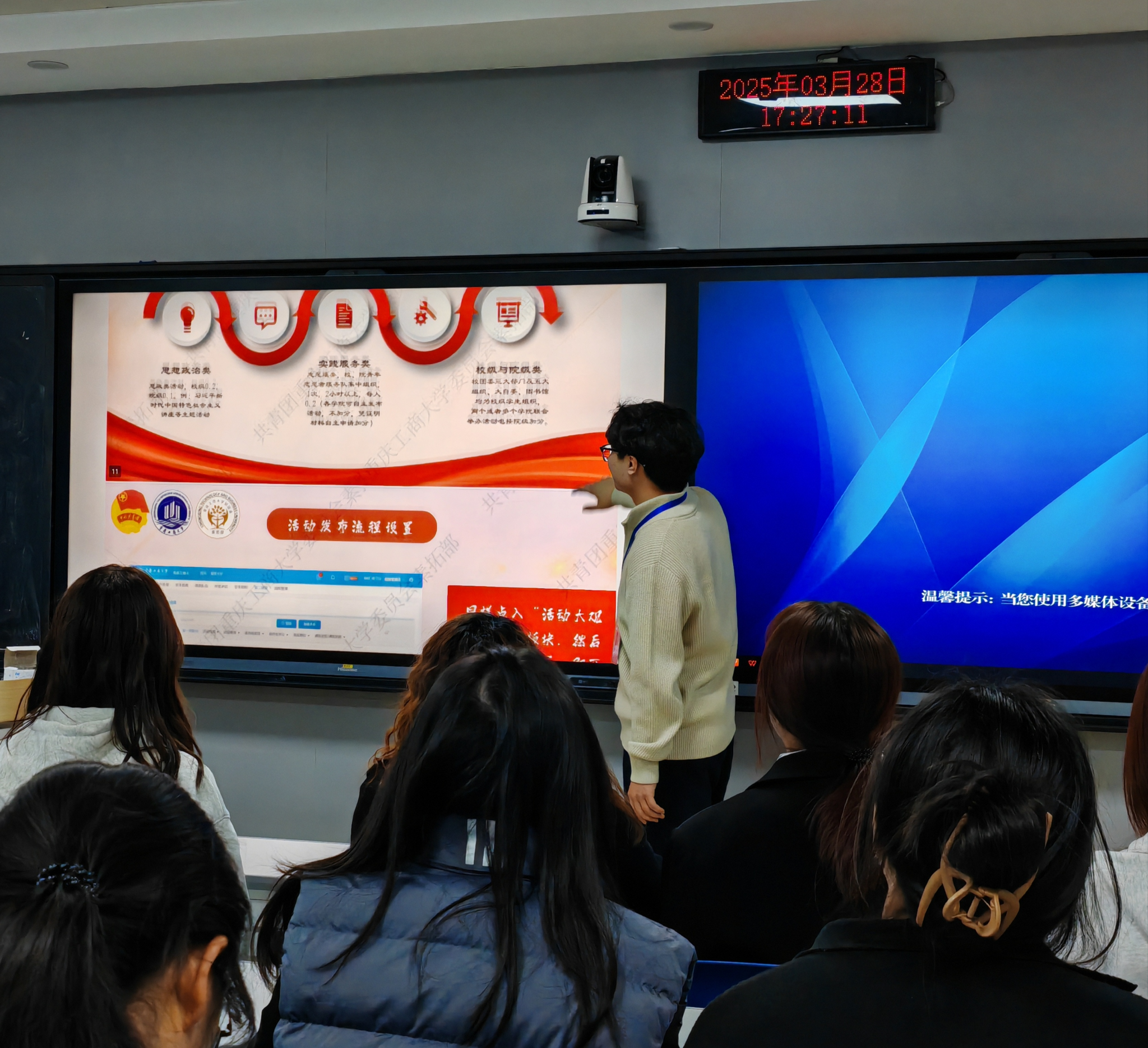 会议分为四项流程。首先,伍文博强调了“数智第二课堂”平台的重要性,并展示了系统进入操作流程。接着,他细致讲解了如何进行活动的发布以及审核,强调了关于活动发布相关内容填写需要注意的细节。随后,进行了本学期的工作安排,要求在每一活动结束五天内完成学分认定。最后,进行了本学期的工作展望,并提出了几点工作注意事项,主席强调要正确填写活动发布表,发布前严格对照发布表填写信息,如遇特殊情况导致活动发布错误,立即联系当周值周部门负责人进行解决。