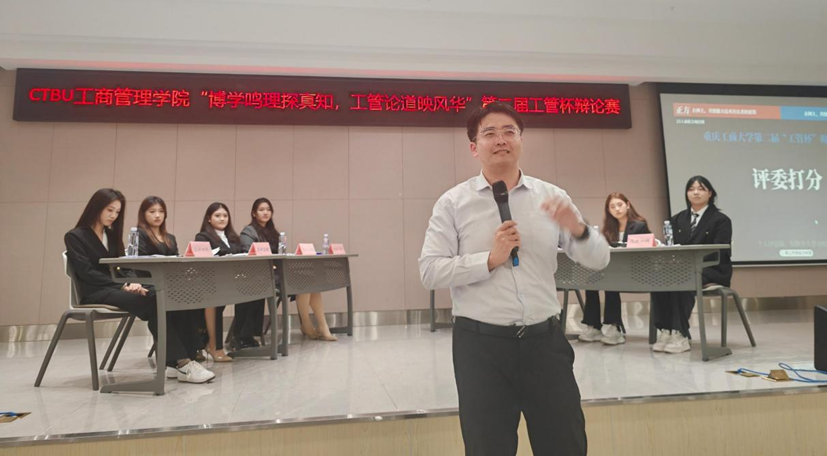 赛事尾声,评委团结合双方表现进行专业点评。评委们从论点架构的完整性、论据支撑的说服力、临场反应的敏捷度等方面,既肯定了两支队伍的亮点与优势,也针对辩论过程中的不足提出了具体优化建议。随后,学生会指导老师边子华作总结讲话,他高度认可全体辩手在赛事中的精彩表现,这场辩论不仅展现了工管学子的青春风采,更传递了理性思辨的精神。他希望同学们能将辩论中培养的逻辑思维和表达能力融入日常学习生活,在不断的思考与交锋中提升自我、成长成才。