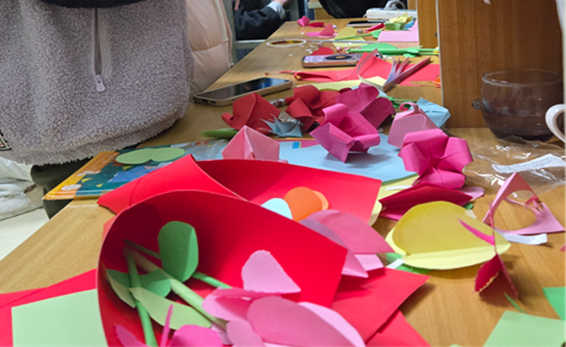 “巧手匠心”手工体验区。空气中弥漫着浓郁的艺术气息与创意灵感,女生们心灵手巧,指尖在五彩纸张间轻盈飞舞,不一会儿,一朵朵栩栩如生的折纸花便在她们手中绽放。这些精美的手工艺品,不仅是创意的结晶,更是女性智慧与创造力的生动体现。