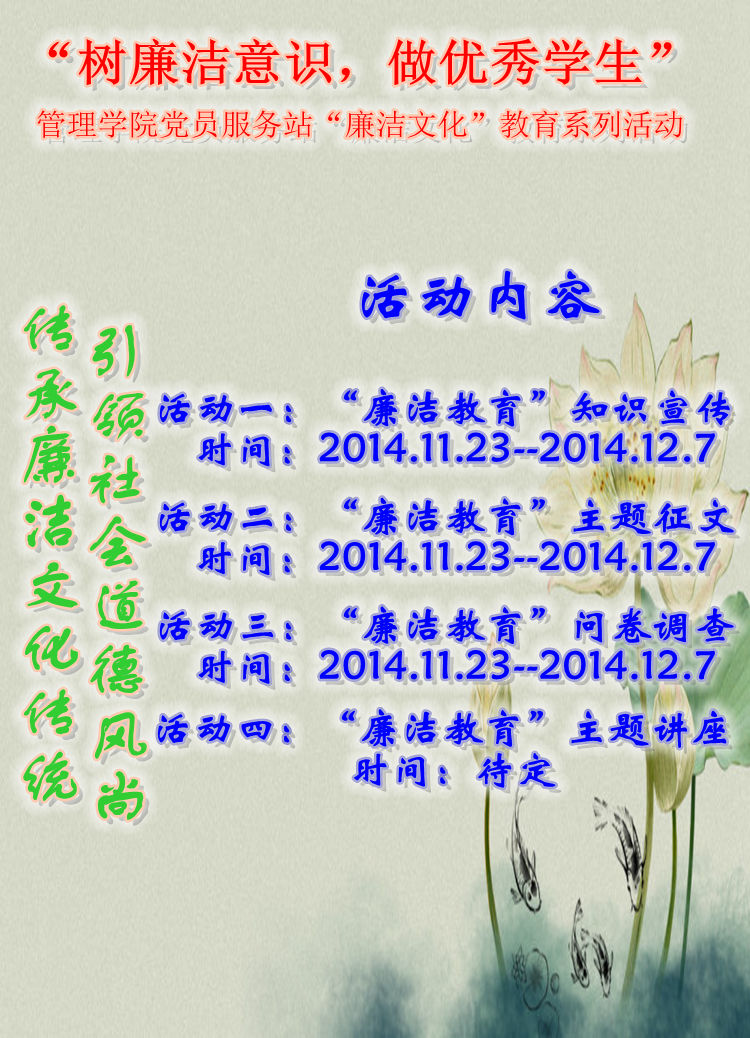 为加深同学们对廉洁文化的理解,管理学院北二、北五党员服务站自11月23日至12月07日开展了为期两周的一系列活动:在北二、北五党服宣传栏张贴廉洁知识宣传海报,同时举行了大学生廉洁意识问卷调查,深入了解了同学们对廉洁的认知水平;开展“廉洁教育”主题征文活动,鼓励同学们拿起自己的笔,畅所欲言地书写对廉洁的理解,表达对党和国家廉政建设的关切。