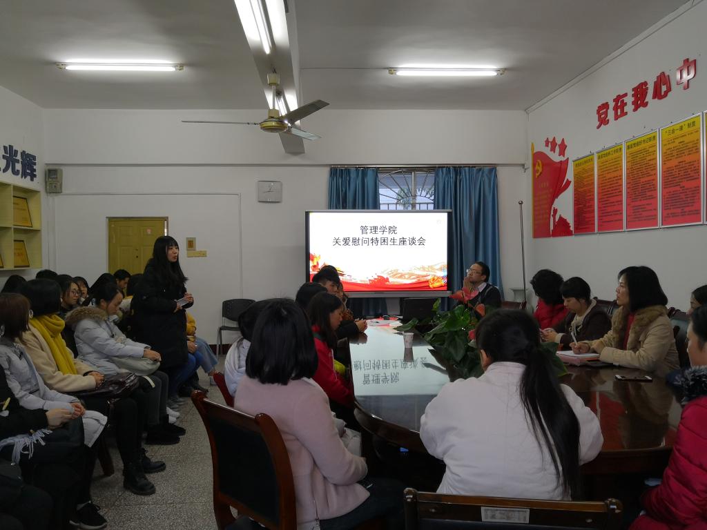 为深入了解特困学生生活和学习情况,给予他们切实有效的帮助,12月19日,管理学院于明德楼3021会议室召开了关爱慰问困难学生座谈会。学院党总副支书记、纪委书记王静,全体辅导员参加了本次座谈会,座谈会由谭予涵老师主持。