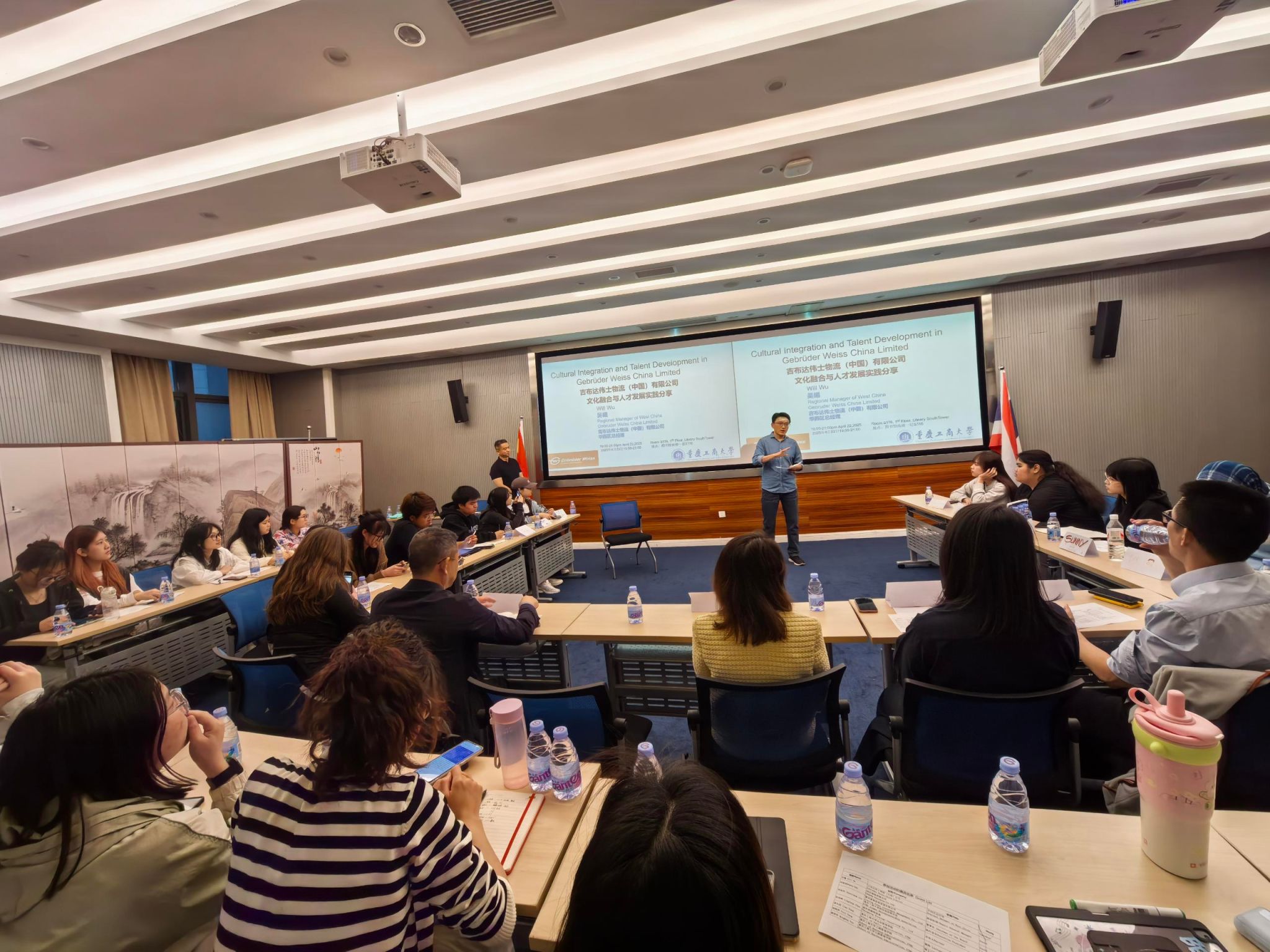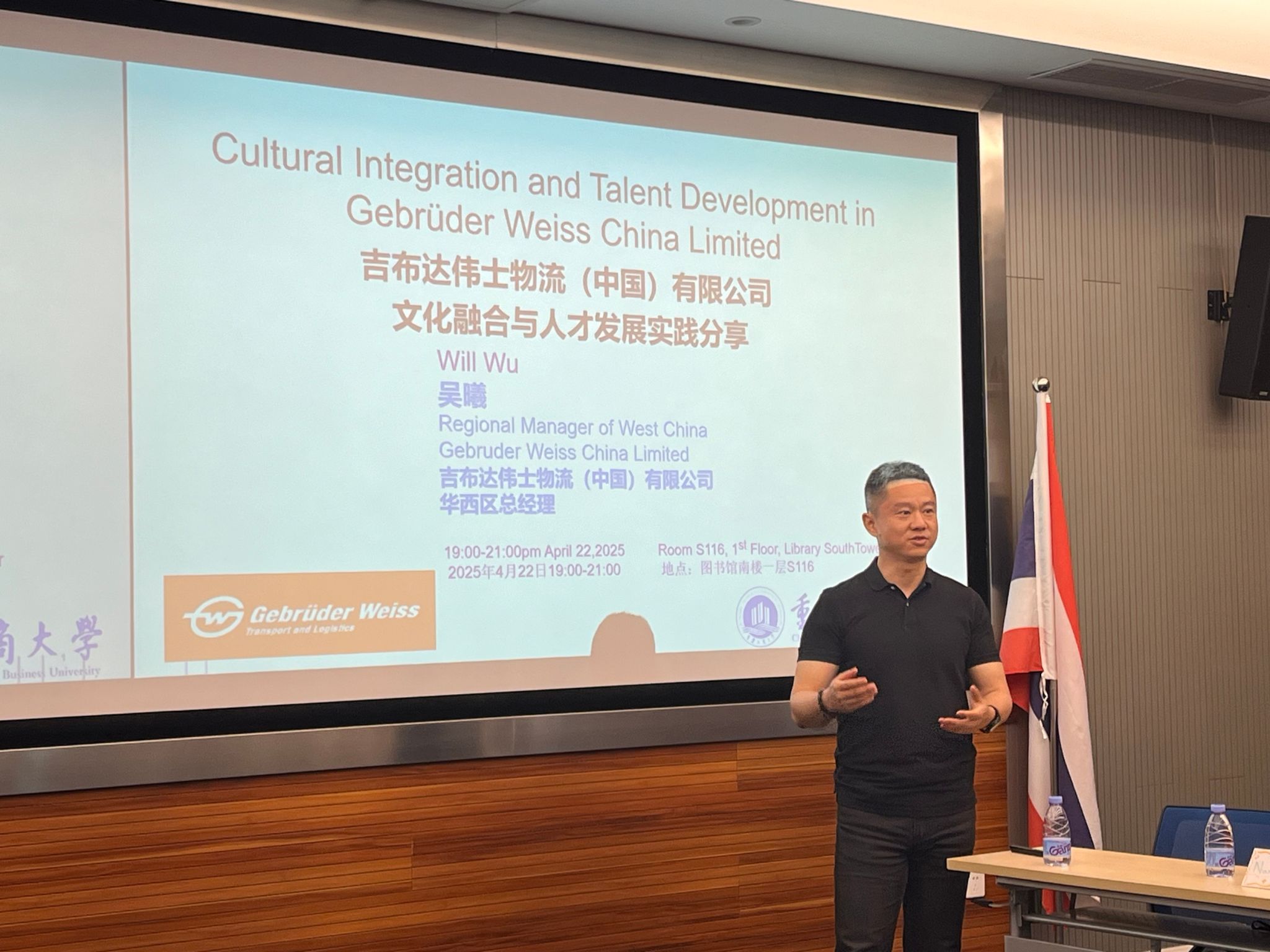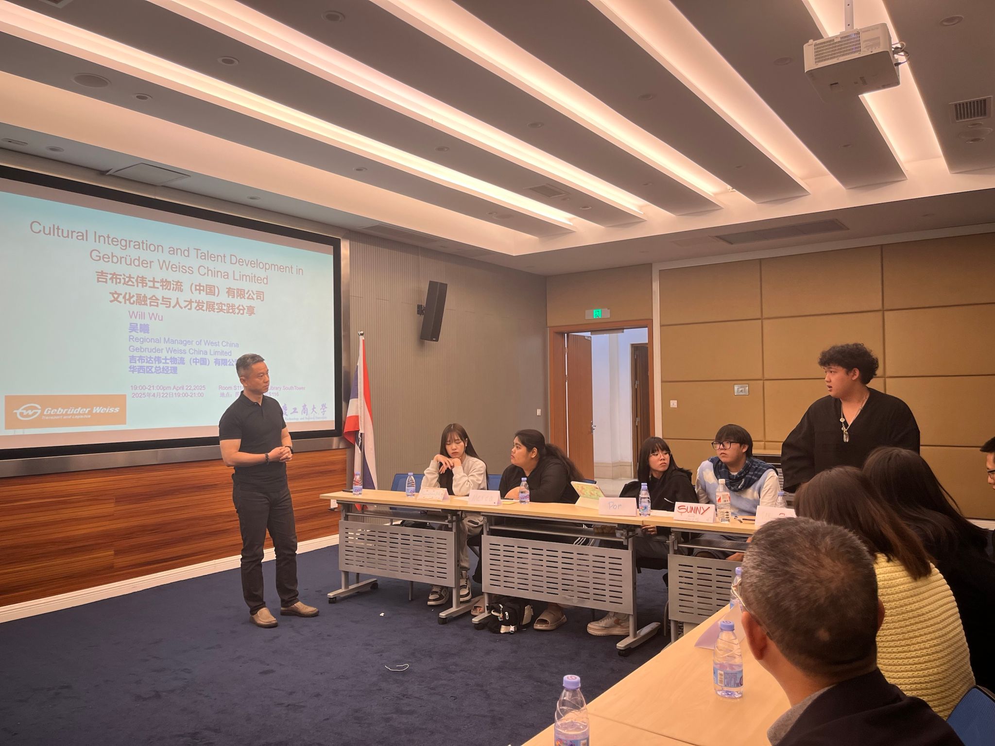 2025年4月22日晚,由44118太阳成tyc城集团鄢清华老师、杨椅伊老师所在的《跨文化管理》(全英文)、《旅游与酒店业人力资源管理》(全英文)及《国际人力资源管理》课程组主办的“跨国企业实践分享”教学环节在图书馆南楼S116教室成功举办。本次活动以“文化融合与国际人才发展实践”为主题,特邀吉布达伟士物流(中国)有限公司(Gebrüder Weiss China)华西区总经理吴曦先生担任主分享人,活动吸引我校人力资源专业、国际旅游管理专业的本科生、研究生及我校来自泰国、越南、乌克兰等国家的10多名国际学生共同参与。利宝保险副总经理邱娅莉女士、重庆工商大学校友创业联合会执行会长金赵亮先生、重庆思略特咨询合伙人陈凌峰先生、公共管理学院唐礼武老师等嘉宾出席,共同探讨跨国企业的文化融合与人才开发实践,全程大部分用英文交流。