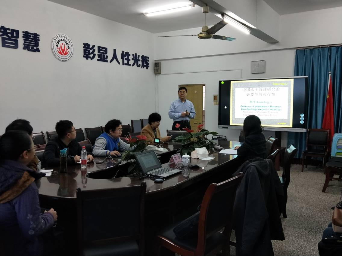 2017年11月29日上午,西交利物浦大学国际企业管理终身正教授、丹麦哥本哈根商学院终身正教授——李平教授受重庆工商大学管理学院的邀请,在重庆工商大学明德楼3021会议室开展了关于《中国本土原创管理学研究的必要性与可能性:兼谈案例研究方法与原创理论构建》的讲座。管理学院副院长黄钟仪教授主持了本次讲座,商务策划学院院长骆东奇教授主持了对话部分;管理学院与商策学院教师及硕士研究生参加了本次讲座。
