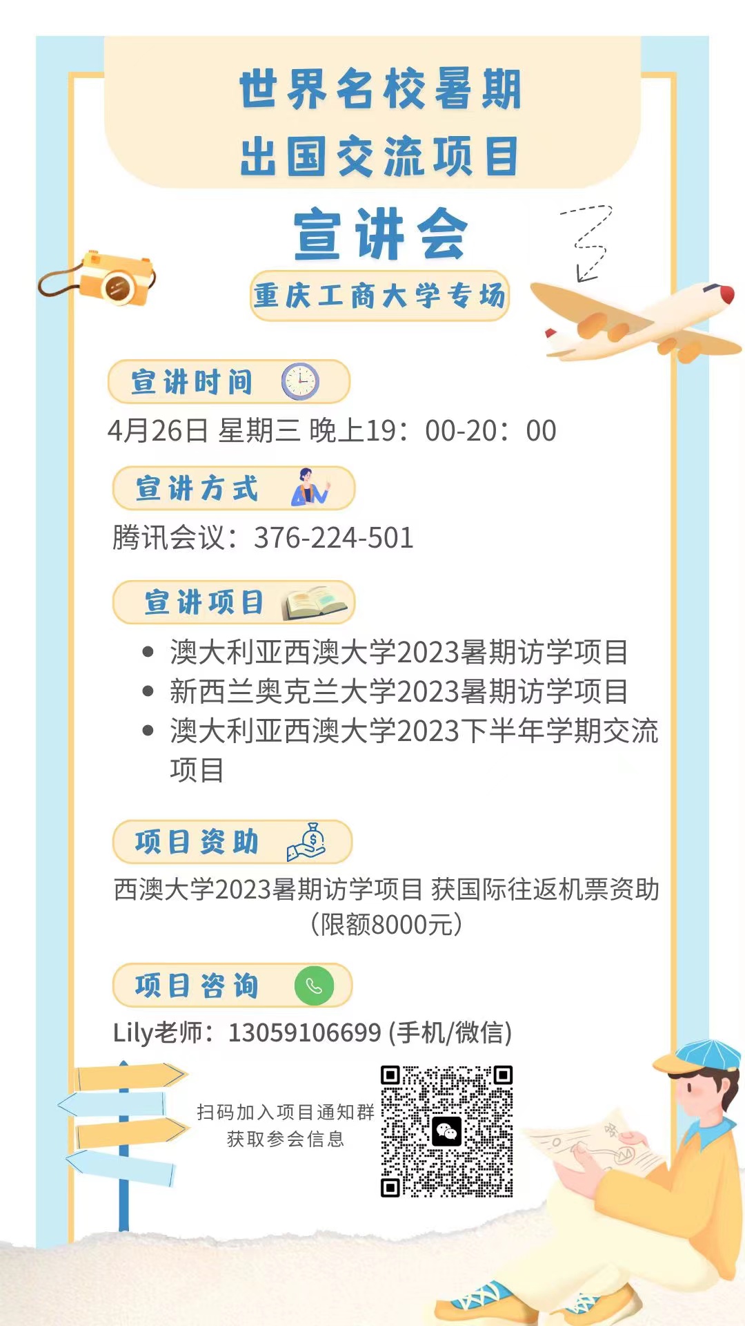 新西兰、澳大利亚学生交流项目线上宣讲会,欢迎感兴趣的同学进入腾讯会议参加。