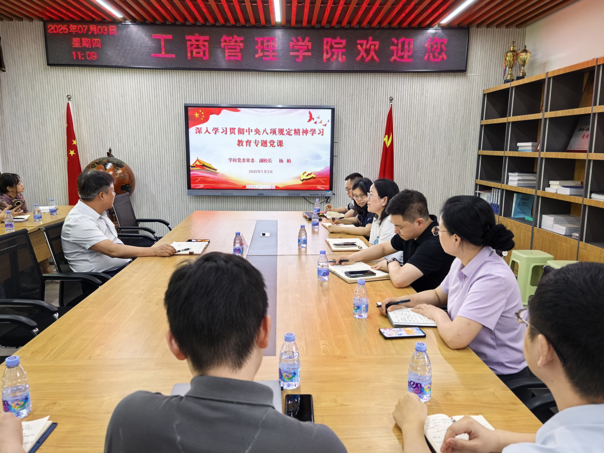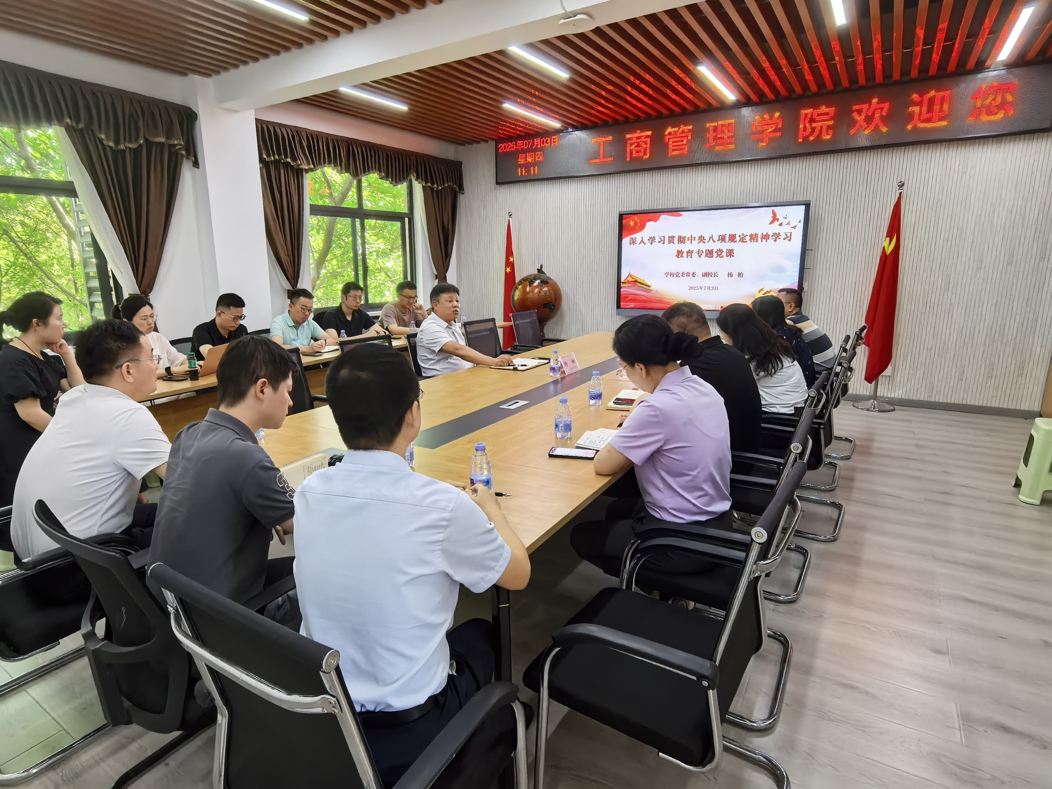 为推进深入贯彻中央八项规定精神学习教育走深走实7月3日,在明德楼4010会议室,学校党委常委、副校长杨柏讲授深入贯彻中央八项规定精神学习教育专题党课。学院领导班子、系部主任参加学习。