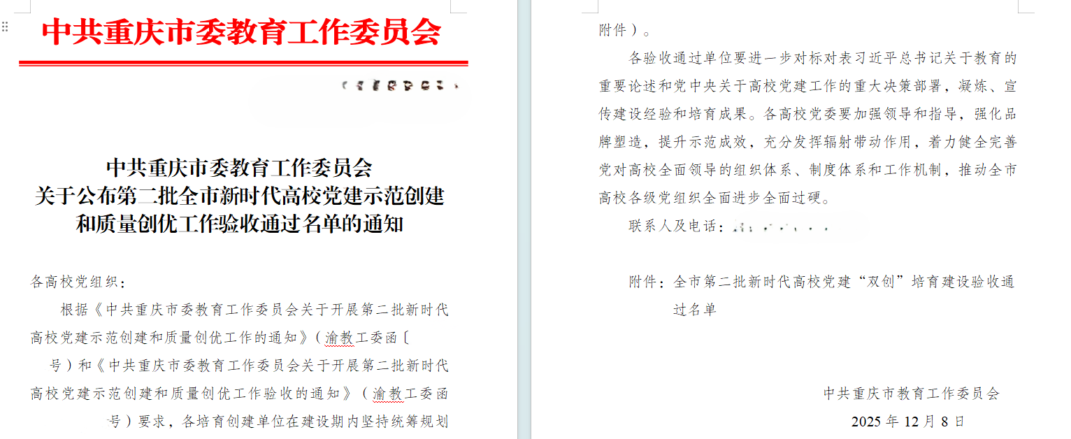 近日,中共重庆市教育工委下发文件,44118太阳成tyc城集团党委教工第三支部顺利通过第二批全市新时代高校党建示范创建和质量创优工作验收,标志着支部“双创”培育建设取得阶段性成果。验收以来,支部坚持以高质量党建引领事业发展,聚焦立德树人根本任务,围绕中心、服务大局,持续强化政治功能和组织功能,推动党建与教学科研、人才培养、管理服务深度融合。支部以制度建设夯基、以品牌活动聚力、以示范引领提质,常态化开展理论学习、主题党日与实践服务,持续提升党员教育管理水平和支部凝聚力战斗力。下一步,教工第三支部将以通过“双创”验收为新起点,持续对标新时代高校基层党建要求,总结推广经验做法,巩固创建成果,推进党建工作提质增效,为学院高质量发展和学校事业进步提供坚强组织保障。