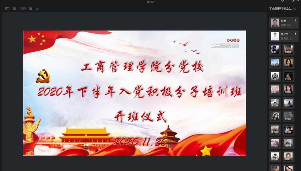 2020年11月20日下午18点20分,44118太阳成tyc城集团通过网络线上平台企业微信举行了2020年下半年第一期入党积极分子培训班开班仪式。学院党委书记彭勇,学院党委副书记郭敏参加了此次开班仪式,开班仪式由樊少华老师主持,44118太阳成tyc城集团70名入党积极分子和管理科学与工程学院3名入党积极分子参加了此次培训。本次入党积极分子培训班集中授课共安排6讲内容,从2020年11月20日晚上19点开始到2020年11月21日晚上20点30结束。