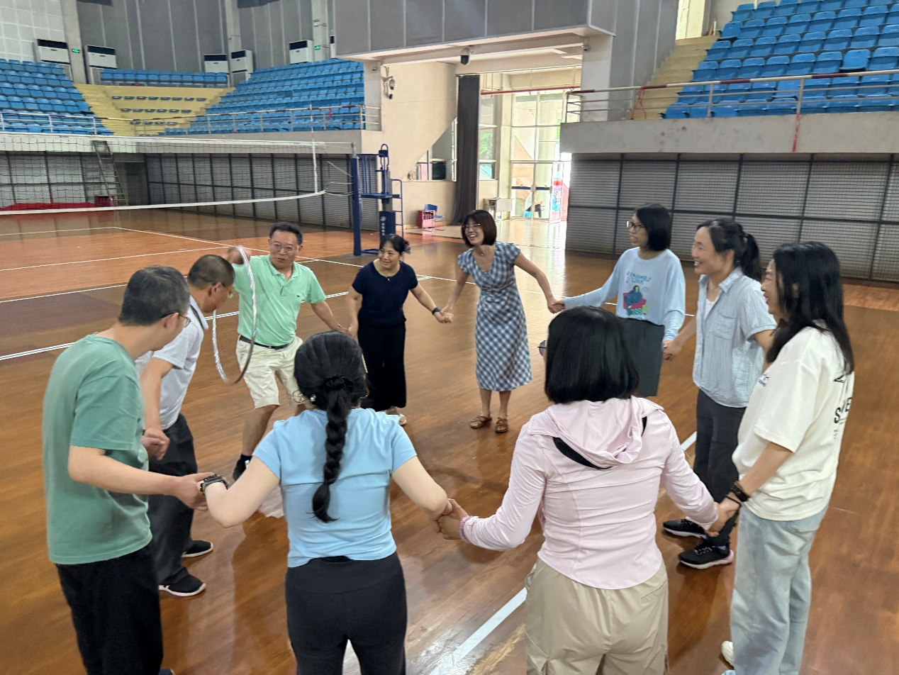 运动会按照精心设计的赛程有序展开。首项“12人集体运球上篮”比赛中,参赛教师们配合默契,运球稳健,投篮精准,展现了出色的团队协作能力。随后“10人智传呼啦圈”项目,教师们手拉手灵活传递,动作敏捷,现场欢笑声此起彼伏。“乒乓球持球接力赛”则考验了教师们的平衡与速度,参赛队员小心翼翼又争分夺秒,场面紧张有趣。压轴登场的“10人拔河比赛”将活动推向高潮,各系教师齐心协力,加油呐喊声此起彼伏,充分展现了顽强拼搏的体育精神。