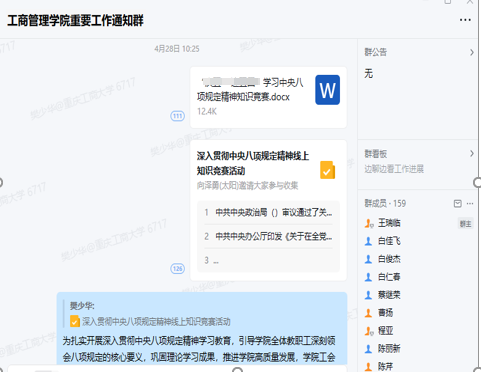 学院工会精心策划本次线上知识竞答活动,以《党政机关厉行节约反对浪费条例》《中央八项规定精神的核心和实质》为基础,精心设计知识竞赛问题,让中央“八项规定”学习教育更具时代特色。本次活动依托企业微信收集表的形式线上开展,学院教职工踊跃参加,共有116名教职工参与线上答题,大家纷纷把本次知识竞答作为提升政治素养的重要契机,通过知识竞答更加准确把握“八项规定”精神实质,并学以致用将学习成果转化为廉洁从教的实际行动。