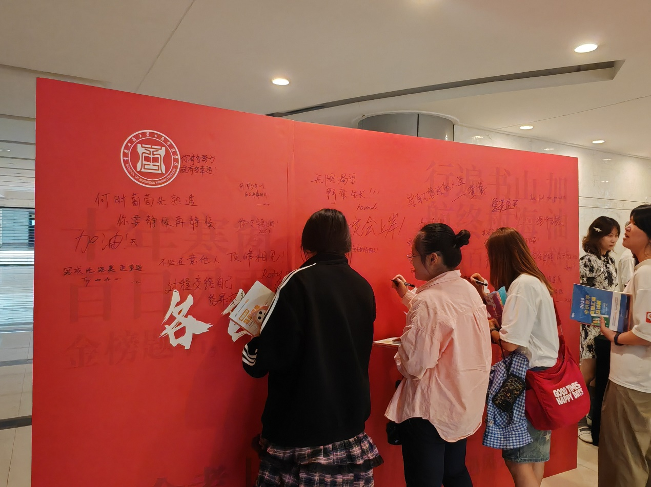 活动现场,同学们认真聆听、踊跃在心愿墙签名,并领取学院精心准备的“考研加油包”,共同约定全力以赴,2026年顶峰相见!