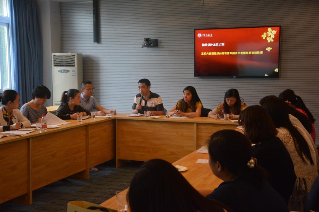 共青团是党的助手和后备军,而高校学生大多是共青团员,稳定好了共青团员的思想行为才能保证大学校园的安全和稳定,同时,加强共青团对大学生思想道德引领也是大学生思想建设的重要渠道。5月13日10:30,由学生处主办,校团委和管理学院共同承办的第十七期辅导员沙龙在启智楼80412举行,本期沙龙主要讨论的话题是“高校共青团组织如何在青年团员中发挥思想引领作用”,校党委副书记、纪委书记周航,学生处处长罗勇、校团委副书记杨娟、校团委副书记吴佑波以及各学院分团委书记和辅导员出席了本次活动。