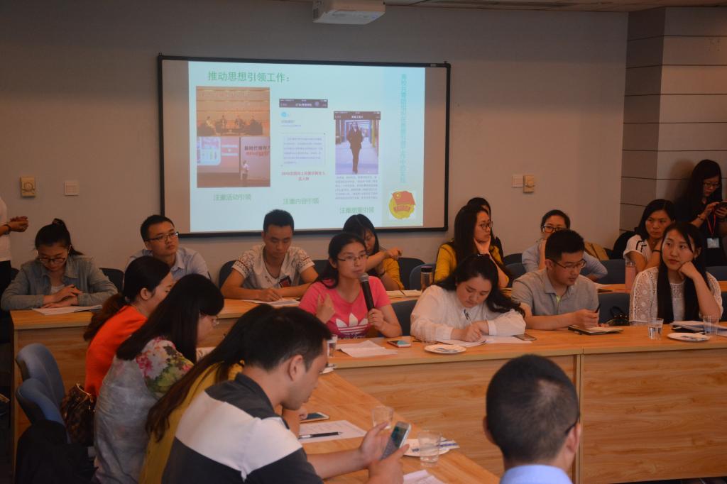 本次沙龙由管理学院分团委书记何祖润主讲,点出高校共青团组织在青年团员中发挥思想引领作用的重要性,以微信公众平台“青春工商大”举例,说明共青团组织区别于其他青年组织最根本的一点就是其思想引领作用。而在当今社会,各类复杂思潮的交汇使得当代大学生有其独到的思维见解,以及各种新技术的出现,都是共青团组织发挥思想引领作用时无法避免的障碍与挑战。随后,她提到做好高校共青团组织的思想引领作用的总体思路是以了解学生的思想动态现状为前提、以把握引领原则为基础、巩固工作阵地为保障、推动工作实效为关键、创新工作方式方法为突破,并充分发挥舆情监察与新媒体的作用以及建立完善需求调查制度。