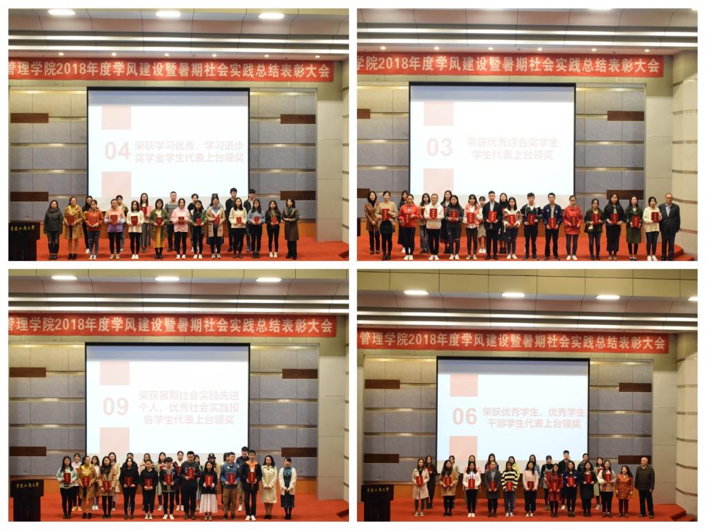 管理学院副院长黄钟仪宣布了2017-2018学年荣获校院两级奖学金的学生名单,副院长周莉分别宣布了管理学院2017-2018学年校院两级评优、学习互助结对子活动获奖学生名单,分团委书记何祖润宣读了暑期社会实践先进个人和优秀社会实践报告获奖学生名单,随后,获奖学生代表分别上台领奖,颁奖领导和老师们对他们表示祝贺。