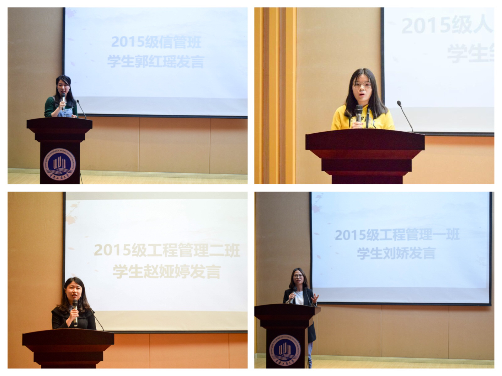 接下来学院分团委书记何祖润宣读了今年考取研究生的学生名单,辅导员刘榴宣读了获得优秀课堂笔记荣誉的学生名单,所有获得表彰和荣誉的学生依次上台领奖。随后,由考取硕士研究生的15级学生代表依次上台为学弟学妹们传授经验。工程管理专业刘娇就出国读研分享了她的经验,提到时间安排的重要性,要有条不紊的做好学习计划并为此做好充分的前期准备。信管专业郭洪瑶则讲述了她报考211学校研究生的经历,以及如何根据自身情况选择合适的学校和如何进行全面复习的问题。人力资源管理专业邹剑虹则分享了备考公务员的经验,她强调要学会利用学校和网上资源,发挥信息资源的最大化效用。最后工程管理专业赵娅婷分享了求职的经验和感慨,强调大学生要注重综合能力的提升为大家介绍简历制作以及面试技巧。