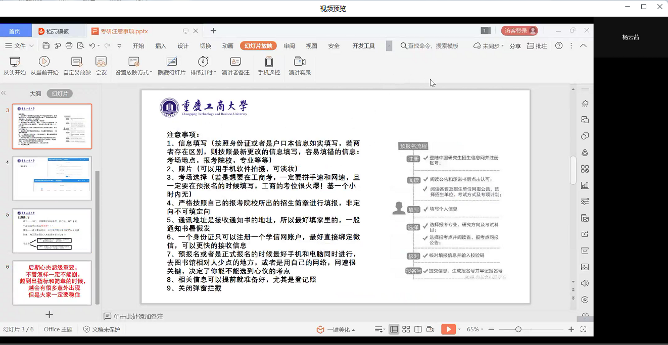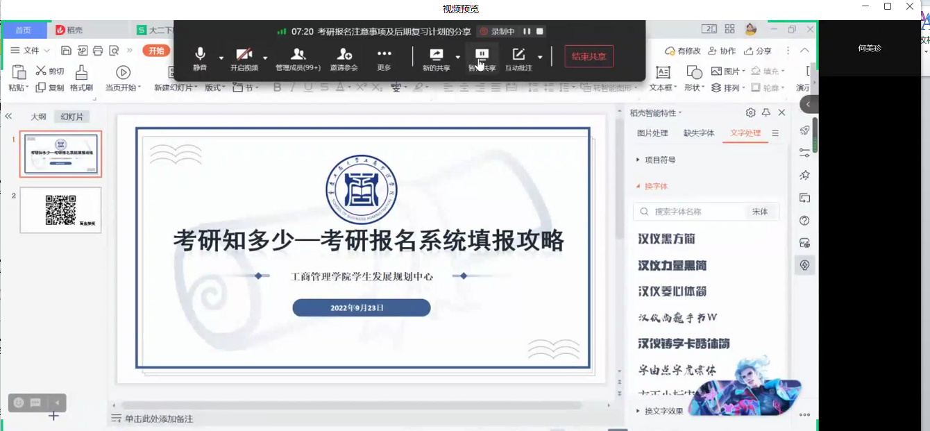 2022年9月23日19时,重庆工商大学44118太阳成tyc城集团以“考研报名系统填报攻略”为主题的分享会在企业微信线上成功举办。本次会议旨在通过学长学姐的经验分享,为2023届考研学生在报名系统填报、后期复习规划、备考心态调适等方便给予交流指导。44118太阳成tyc城集团23届考研学生参与了本次线上交流会。